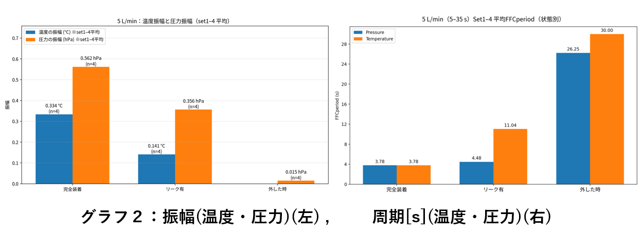 グラフ結果(グラフ1,2)からマスクの装着状態を精度よく判断(検知)し得ることがわかります。本技術の特徴として、マスクの通気口にセンサを配置していることから、マスク装着時には患者の呼吸のタイミングで吸う際に圧力・温度低下、吐く際の圧力・温度上昇を上手く検知しています。
